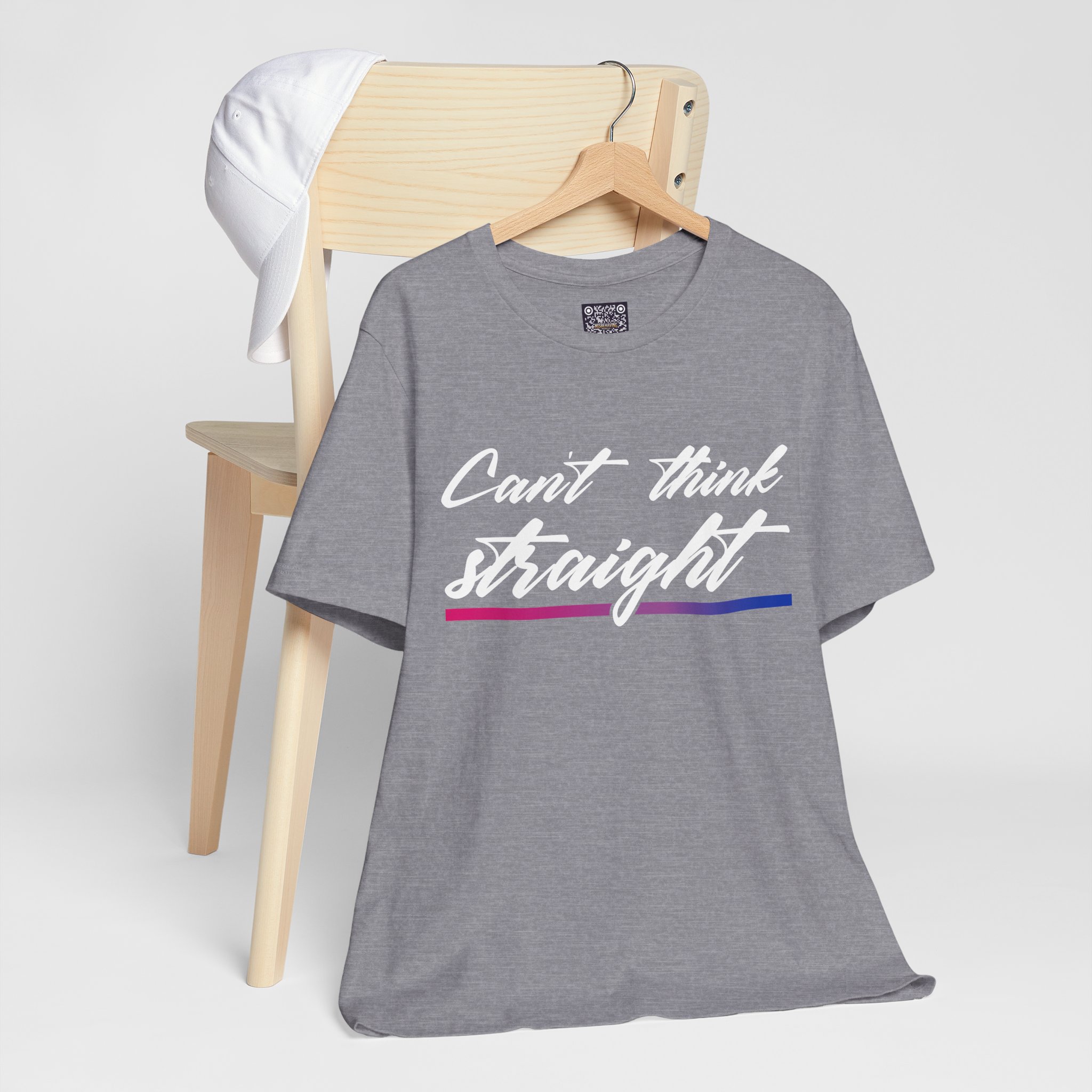 This lightweight jersey tee brings a playful, confident voice to everyday wear. The bold script “Can’t think straight” sits above a subtle pansexual pride stripe, letting humor and identity mingle in a low-key, stylish way. Wear it to casual meetups, Pride events, or wherever you want an easy conversation starter — it layers well under jackets or stands alone with jeans. The soft Airlume combed cotton feels breathable on warm days and comfortable for long hours out. Details like ribbed collar, shoulder tape, and side seams keep the fit neat through repeated wear, while a tear-away label prevents irritation. Thoughtfully made with sustainability and fair labor practices in mind, this tee balances personality with everyday practicality.