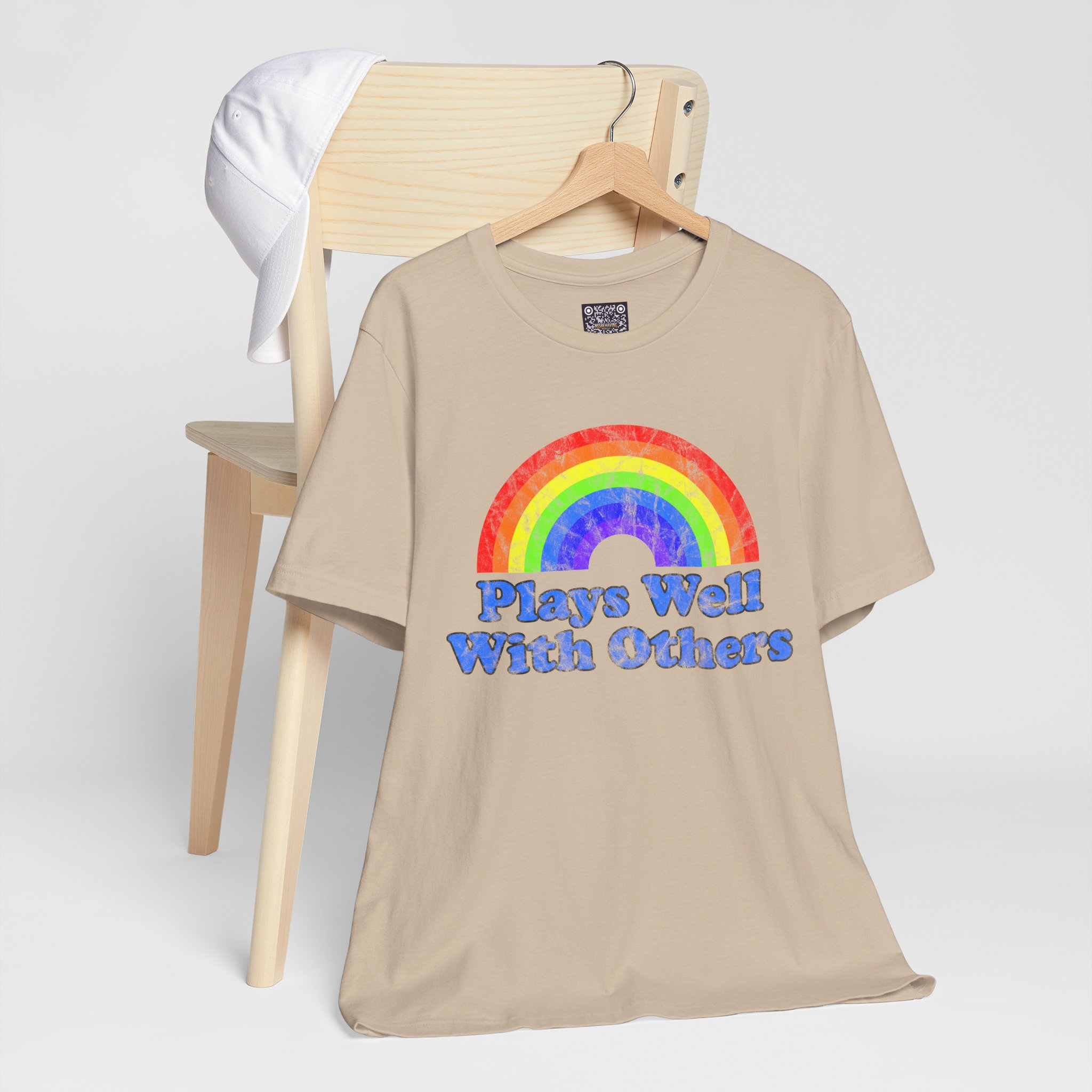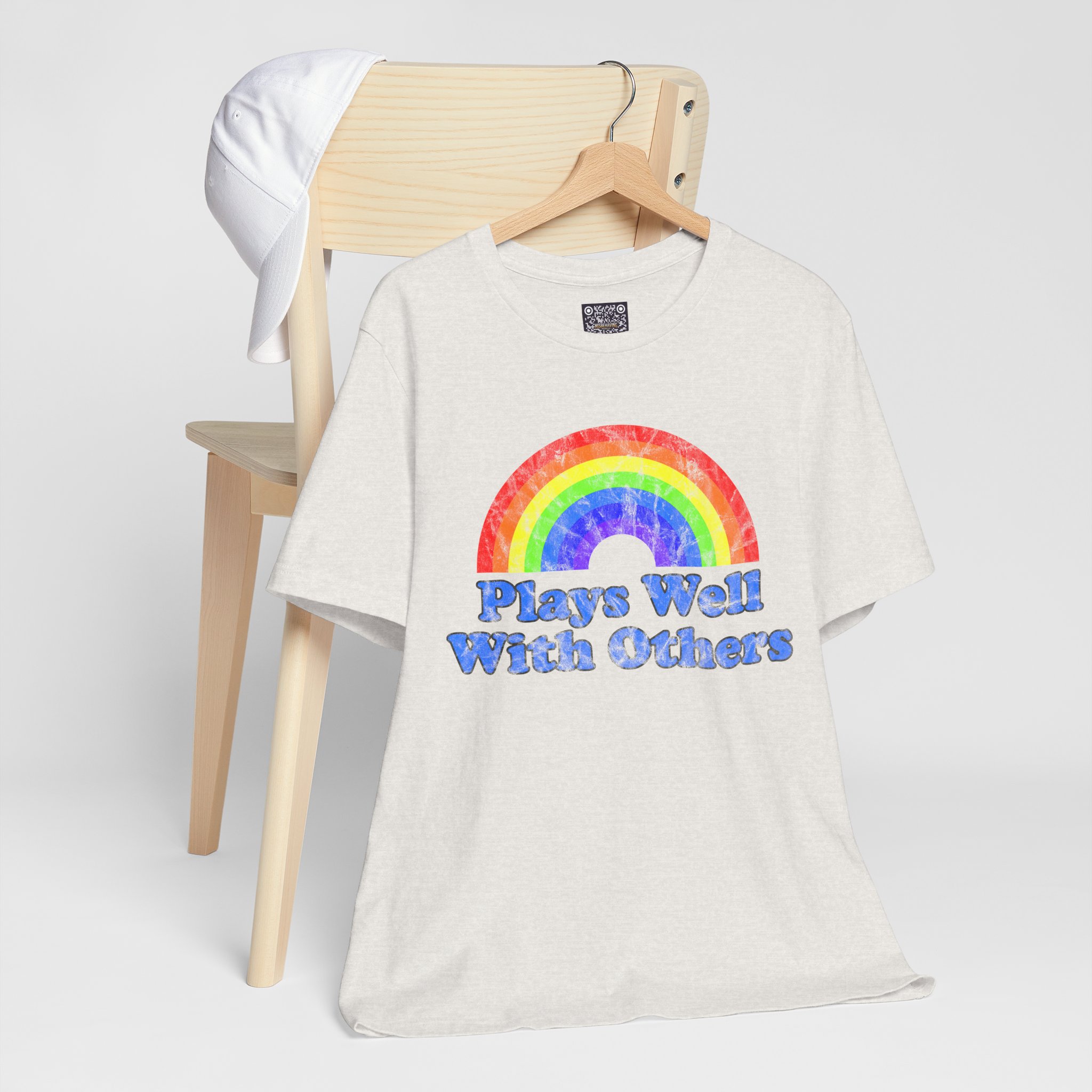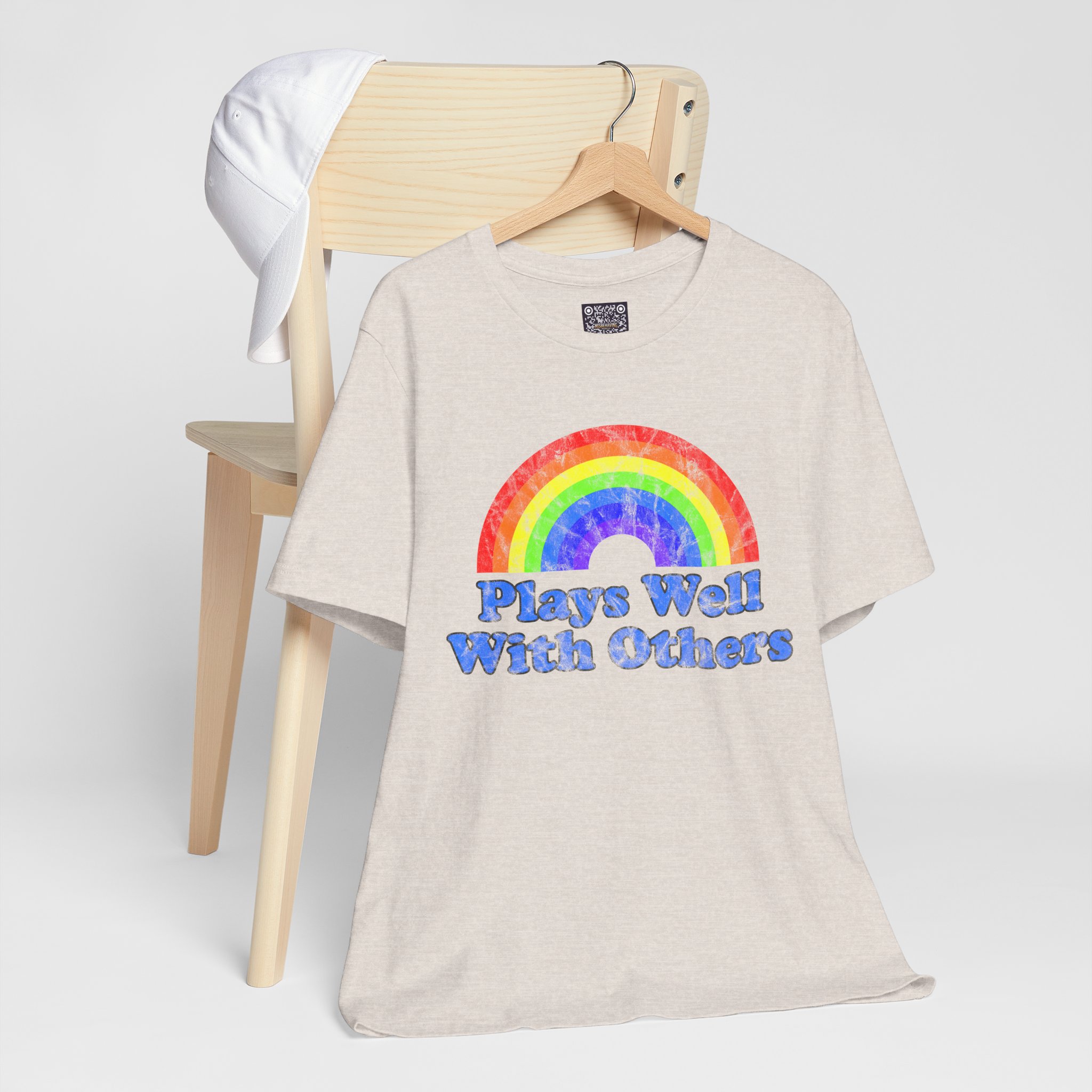Soft, breathy cotton meets a joyful, retro vibe. This lightweight tee wears like a second skin — airy enough for warm days, substantial enough to layer under a jacket. Front art features a hand-painted, watercolor-style rainbow above chunky, groovy lettering that reads “Plays Well With Others,” giving the shirt a playful, optimistic energy. The crew neckline and retail cut keep the silhouette neat; side seams and shoulder tape help it keep its shape through repeated wear. It’s made with responsibly produced Airlume combed and ring-spun cotton and finished with a tear-away label for itch-free comfort. Wear it to brighten a weekday, bring it to casual meetups, or toss it in your travel bag for easy layering.