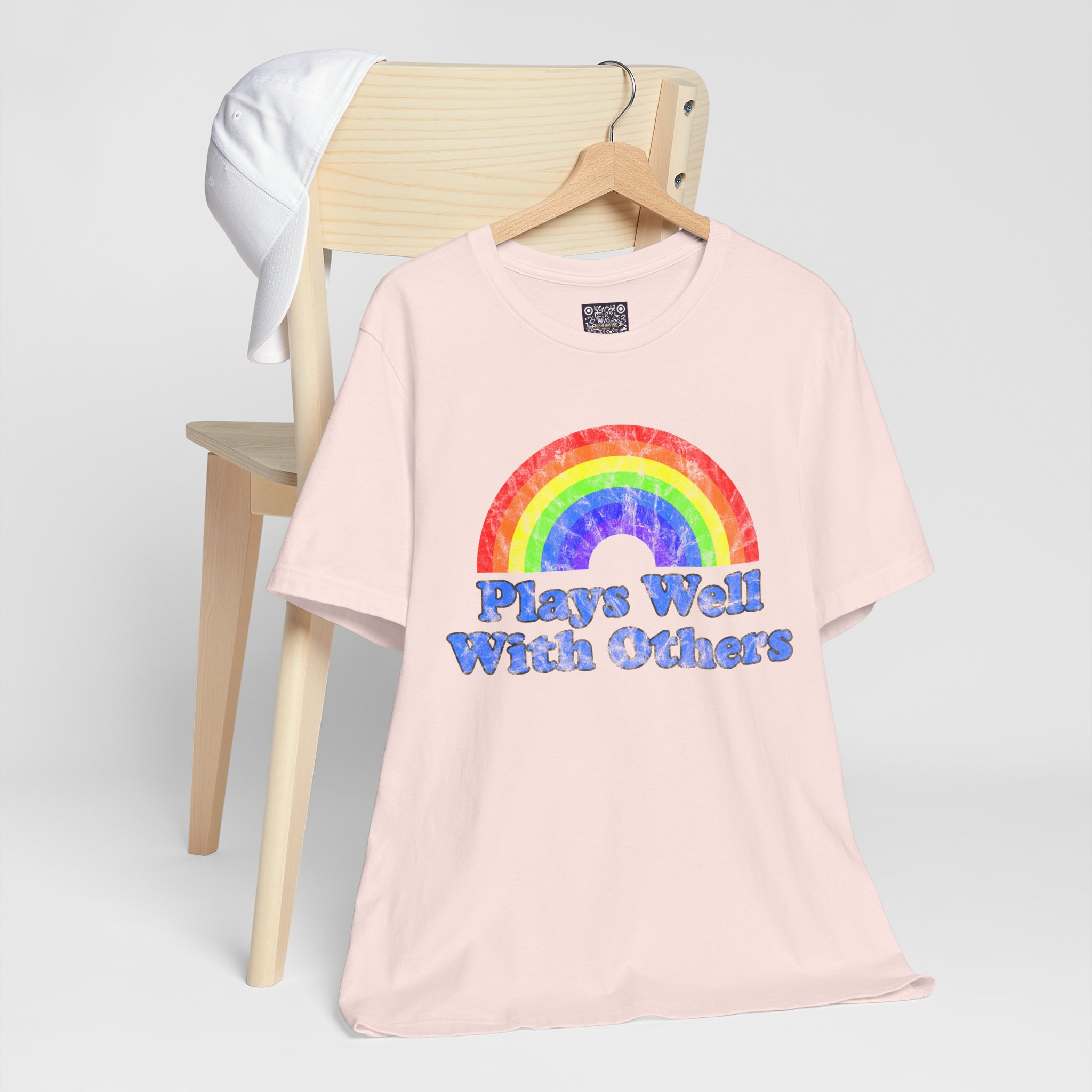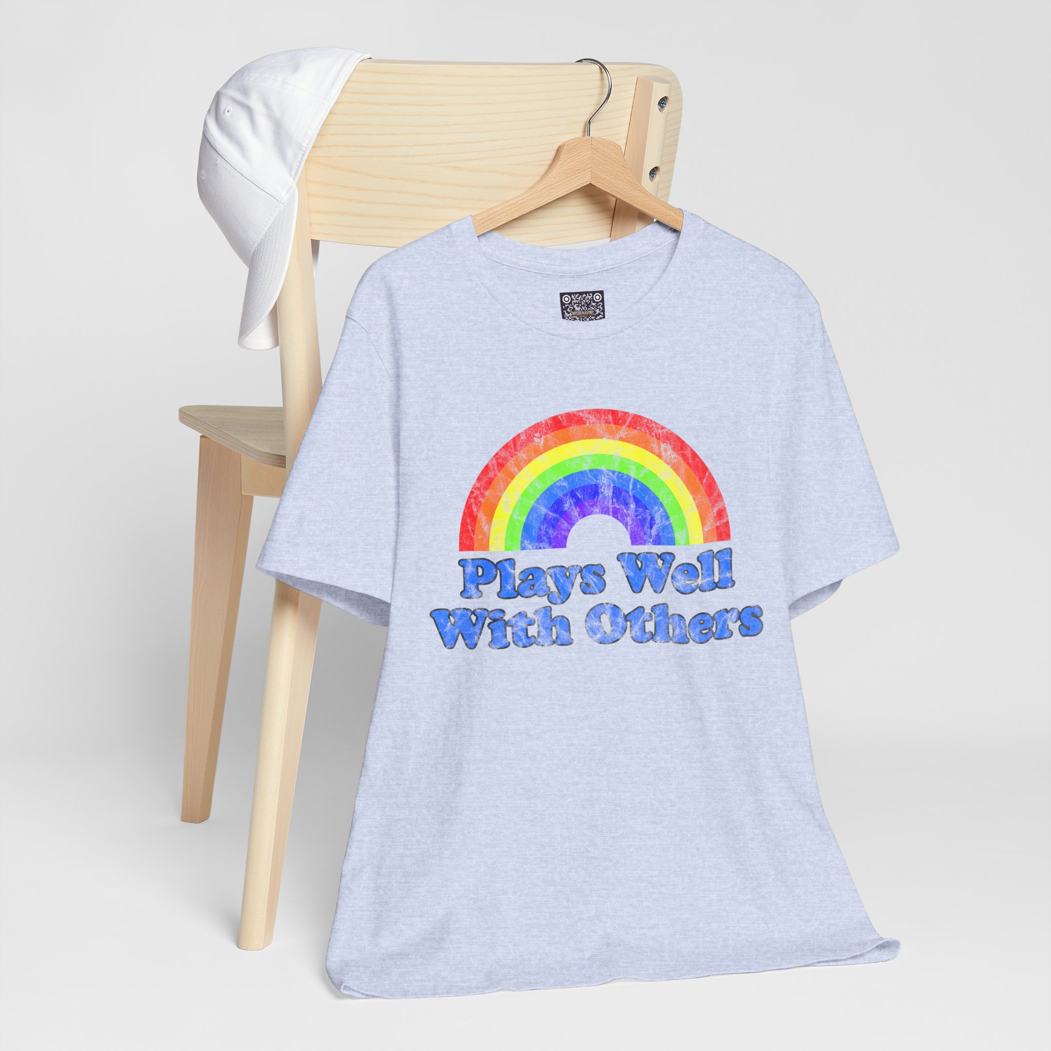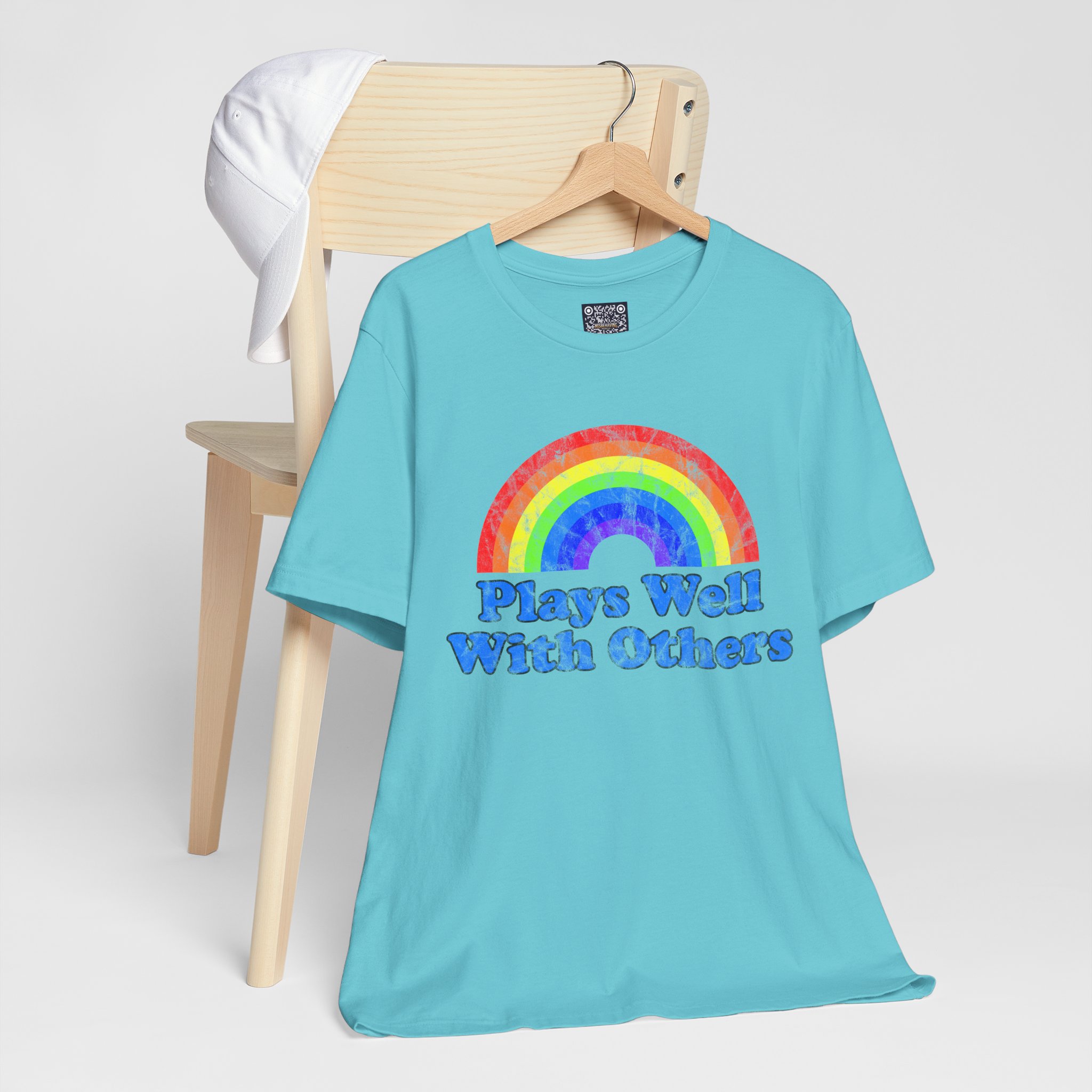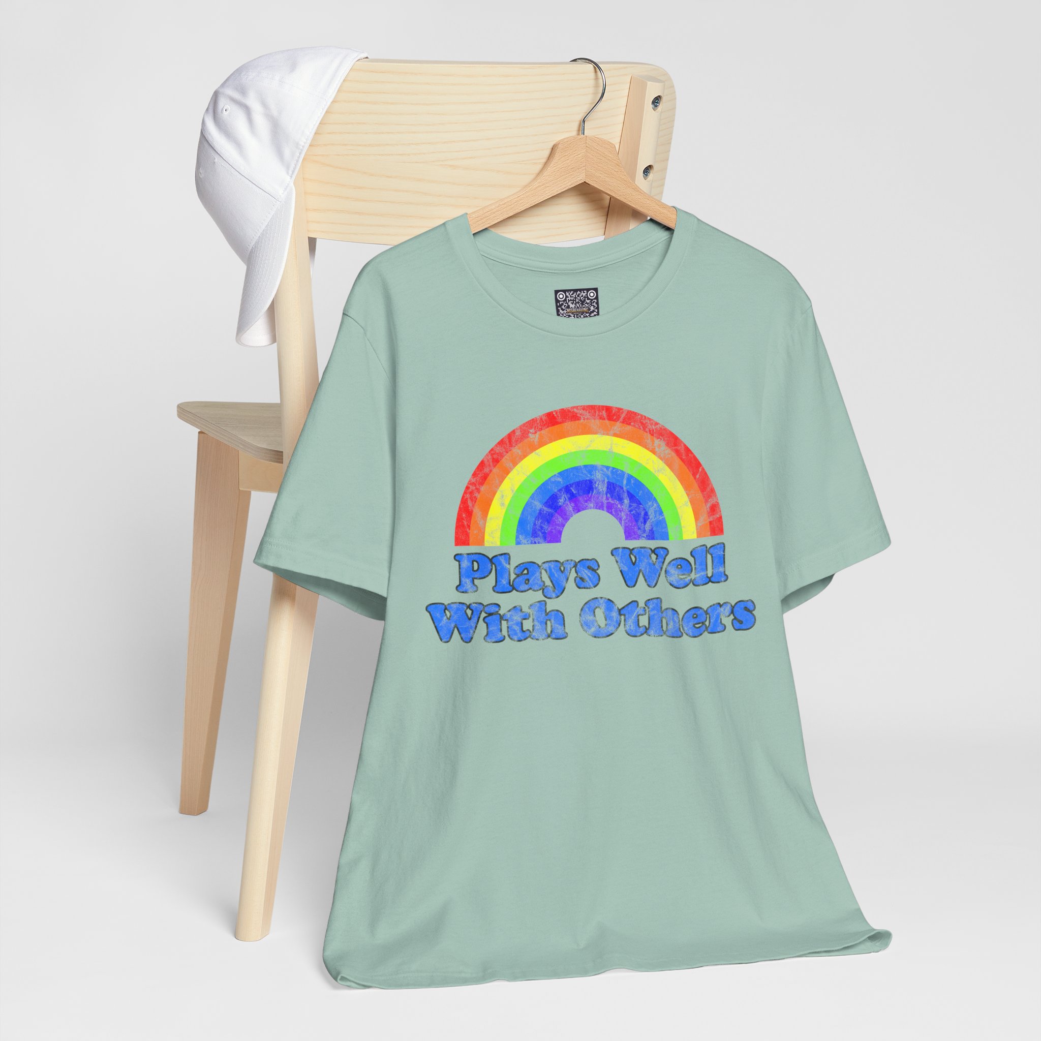 Soft, breathy cotton meets a joyful, retro vibe. This lightweight tee wears like a second skin — airy enough for warm days, substantial enough to layer under a jacket. Front art features a hand-painted, watercolor-style rainbow above chunky, groovy lettering that reads “Plays Well With Others,” giving the shirt a playful, optimistic energy. The crew neckline and retail cut keep the silhouette neat; side seams and shoulder tape help it keep its shape through repeated wear. It’s made with responsibly produced Airlume combed and ring-spun cotton and finished with a tear-away label for itch-free comfort. Wear it to brighten a weekday, bring it to casual meetups, or toss it in your travel bag for easy layering.